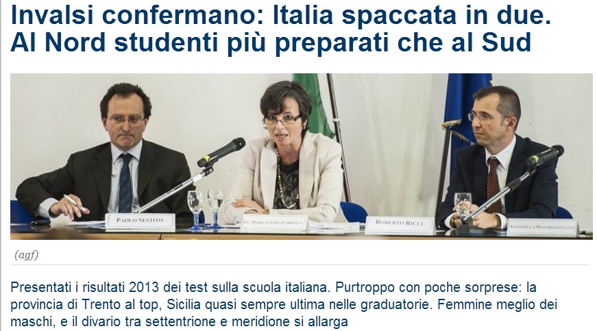 “….IL RAPPORTO sugli apprendimenti 2013 dell’Invalsi promuove la scuola di Trento e rimanda a settembre quella meridionale.