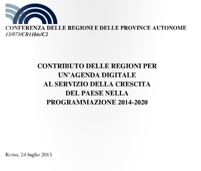 “….Le regioni considerano il “digitale” un elemento strategico per il futuro, al punto da assumere una posizione unitaria sull’agenda digitale per indirizzare, nei piani di tutte le regioni e province autonome che saranno elaborati da qui a fine anno, un uso lungimirante delle risorse della programmazione 2014-2020 anche in raccordo con altre risorse nazionali e regionali (ad es. quelle della Sanità).