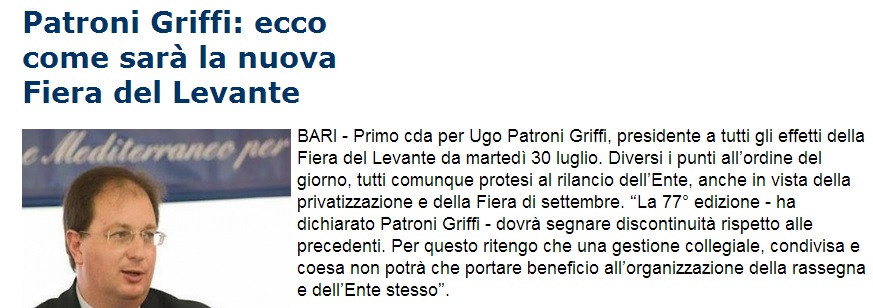 NOME PER NOME….I CONSULENTI CHE LAVORERANNO AL RILANCIO DELLA FIERA DEL LEVANTE DI BARI Pubblicato da:Rino Scoppio 15 agosto 2013 — Lascia un commento http://www.lagazzettadelmezzogiorno.it/patroni-griffi-ecco-come-sara-la-nuova-fiera-del-levante-no643002 Condividi questo articolo sui Social NetworkTweet Fai clic per condividere su Youtube (Si apre in una nuova finestra) Youtube Fai clic per condividere su Flickr (Si apre in una nuova finestra) Flickr Fai clic per condividere su Pinterest (Si apre in una nuova finestra) Pinterest Fai clic per condividere su Slideshare (Si apre in una nuova finestra) Slideshare Fai clic per condividere su Google + (Si apre in una nuova finestra) Google + Mi piace Caricamento... Correlati