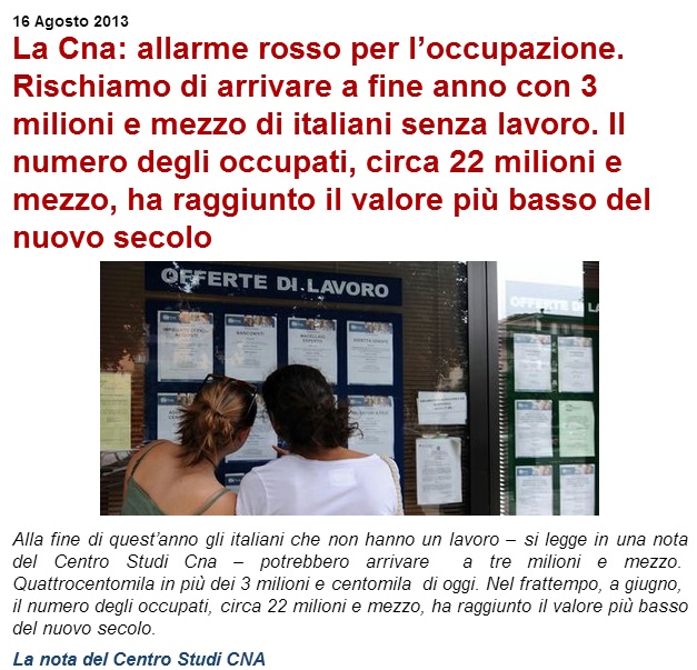 NESSUNO DOVREBBE PARLARE DI RIPRESA ECONOMICA FINO A QUANDO AVREMO QUESTI NUMERI DA BRIVIDO Scarica la ricerca della CNA su Occupazione & Disoccupazione in Italia. Pubblicato da:Rino Scoppio 17 agosto 2013 — Lascia un commento http://www.cna.it/content/download/106814/1352293/file/NOTA_CentroStudiCNA_1ago2013.pdf Condividi questo articolo sui Social NetworkTweet Fai clic per condividere su Youtube (Si apre in una nuova finestra) Youtube Fai clic per condividere su Flickr (Si apre in una nuova finestra) Flickr Fai clic per condividere su Pinterest (Si apre in una nuova finestra) Pinterest Fai clic per condividere su Slideshare (Si apre in una nuova finestra) Slideshare Fai clic per condividere su Google + (Si apre in una nuova finestra) Google + Mi piace Caricamento... Correlati