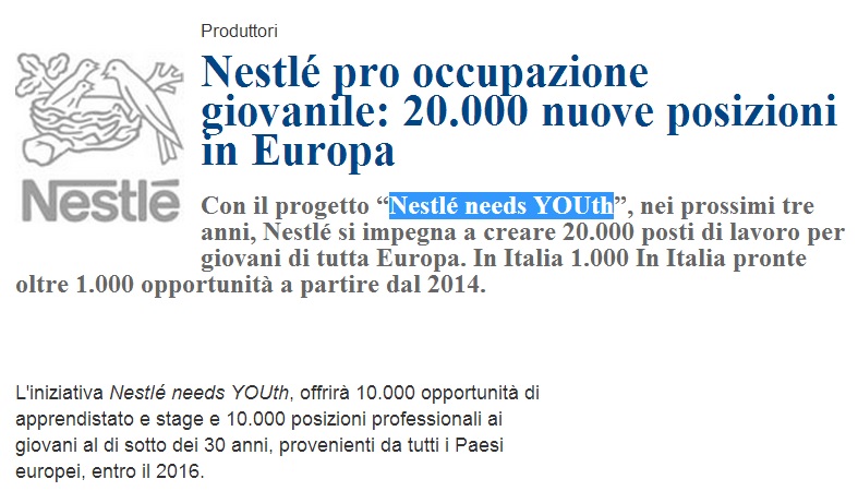 “….L’iniziativa Nestlé needs YOUth, offrirà 10.000 opportunità di apprendistato e stage e 10.000 posizioni professionali ai giovani al di sotto dei 30 anni, provenienti da tutti i Paesi europei, entro il 2016.