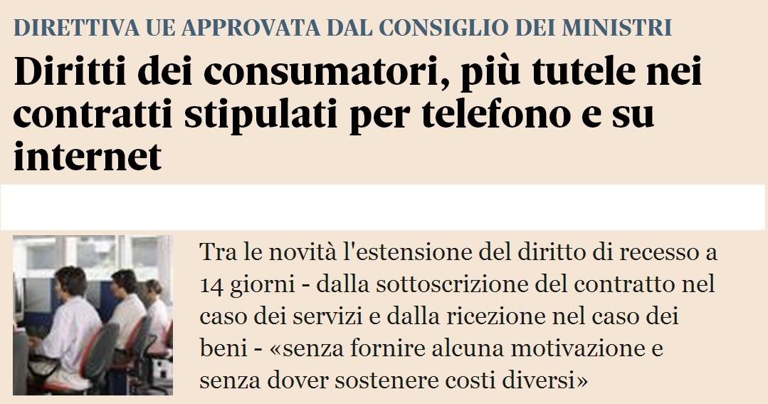 “…Finalmente i consumatori saranno più tutelati nei contratti a distanza, cioè in quelli stipulati al di fuori dei locali commerciali (ad esempio al telefono o su Internet).