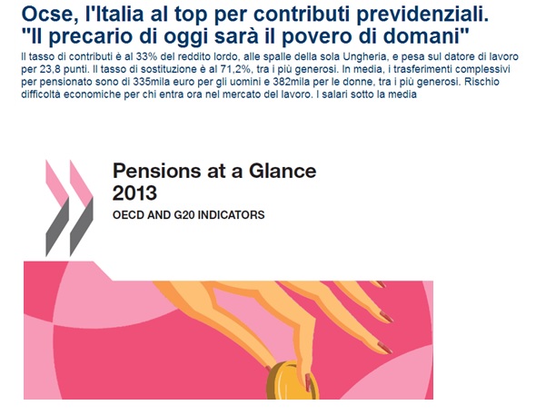 Il tasso italiano dei contributi pensionistici nel 2012 era infatti pari al 33% del reddito lordo, in aumento dal 28,3% del 1994, contro una media Ocse del 19,6%.