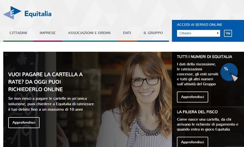 ECCO IL NUOVO SITO WEB DI EQUITALIA. Molto cool Pubblicato da:Rino Scoppio 11 dicembre 2014 — Lascia un commento Da oggi si potranno anche richiedere le rateazioni on line. Ecco il nuovo sito web di Equitalia Condividi questo articolo sui Social NetworkTweet Fai clic per condividere su Youtube (Si apre in una nuova finestra) Youtube Fai clic per condividere su Flickr (Si apre in una nuova finestra) Flickr Fai clic per condividere su Pinterest (Si apre in una nuova finestra) Pinterest Fai clic per condividere su Slideshare (Si apre in una nuova finestra) Slideshare Fai clic per condividere su Google + (Si apre in una nuova finestra) Google + Mi piace Caricamento... Correlati