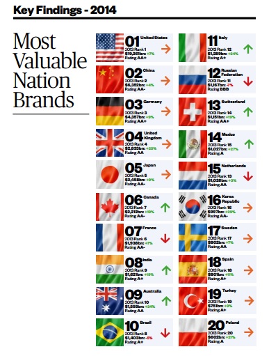Il primo brand nazionale per valore economico nella classifica 2014, appena pubblicata, è quello degli Stati Uniti, con un valore di 19,2 triliardi di dollari, seguito da quello della Cina, con un valore però più che dimezzato e pari a 6,3 triliardi di dollari, e dal brand Germania, che vale 4,3 triliardi di dollari.