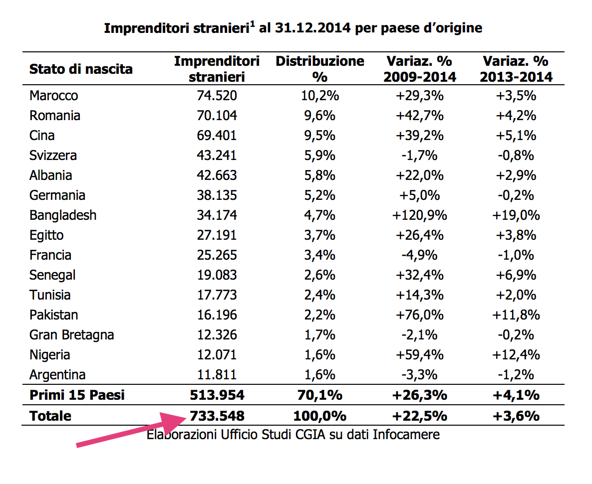 Tra il 2013 e il 2014, le imprese di immigrati sono cresciute di un altro 4,1 per cento, raggiungendo in valore assoluto le 733.500 unità.