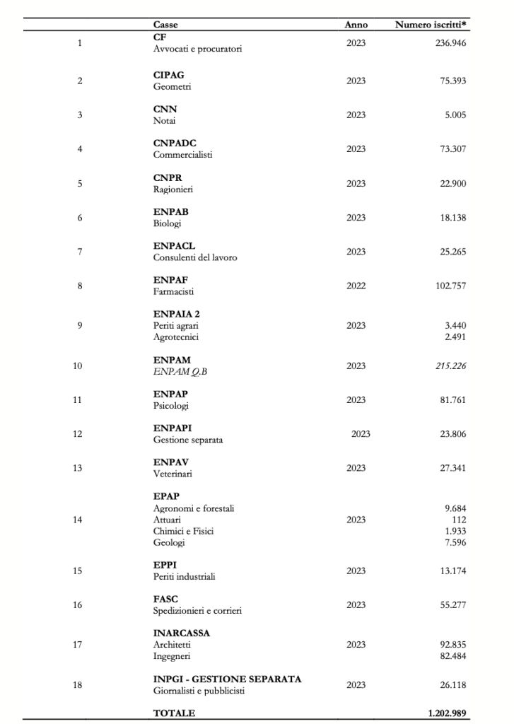 E infine, ecco l’elenco degli iscritti agli enti di previdenza collegati agli ordini professionali.