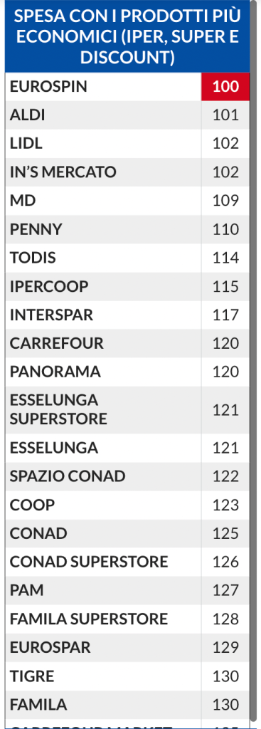 Svetta in classifica il discount italiano Eurospin di proprietà delle famiglie Pozzi, Mion, Odorizzi, Barbon