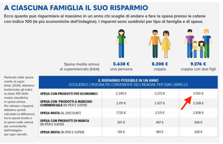 Dall’analisi emerge che, scegliendo con attenzione l’insegna e puntando sui prodotti più economici in vendita, una famiglia composta da quattro persone può arrivare a risparmiare fino a 3.700 euro in dodici mesi.