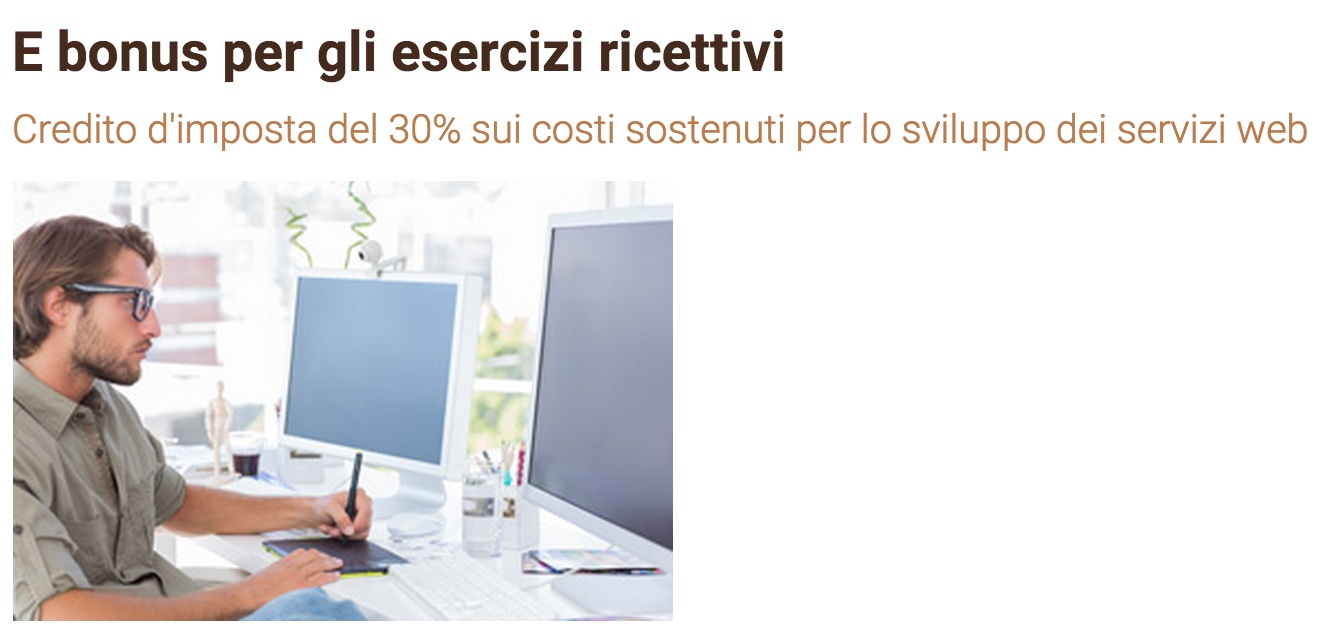L’agevolazione riguarda gli anni 2014, 2015 e 2016, e consiste in un credito d’imposta pari al 30% dei costi sostenuti per investimenti e attività di sviluppo e promozione per la digitalizzazione dei servizi turistici, da ripartire in tre quote annuali di pari importo, fino a un importo complessivo massimo di 12.500 euro nel triennio.