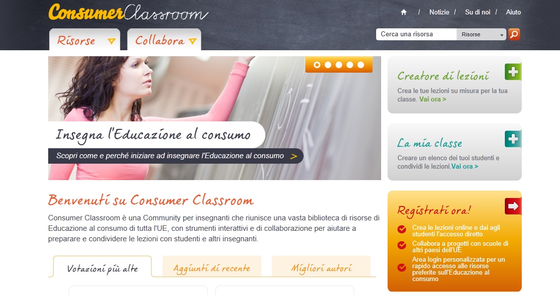“…Per promuovere l’educazione al consumo e favorire il suo insegnamento tra gli studenti di età compresa tra i 12 -18 anni, l’Unione europea ha lanciato il nuovo portale multilingue www.ConsumerClassroom.eu, dal 2 aprile on-line anche in italiano.