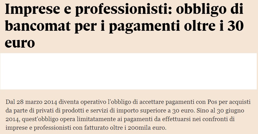 “…Sarà ufficialmente in vigore a partire dal 28 marzo 2014 l’obbligo di pagare con sistemi di tracciabilità le spese per commercialisti, dentisti, avvocati e liberi professionisti in generale.
